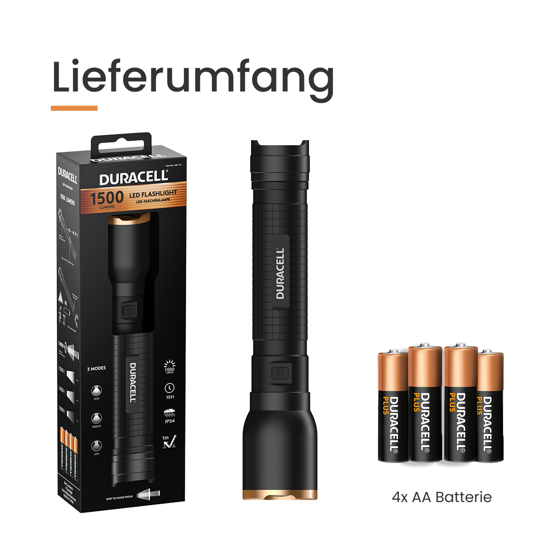 Die Taschenlampe wird mit 4xAA Alkaline-Batterien betrieben, die für eine lang anhaltende und zuverlässige Energieversorgung sorgen. Diese Batterien bieten eine stabile Leistung und sind einfach auszutauschen, sodass die Lampe jederzeit einsatzbereit ist.